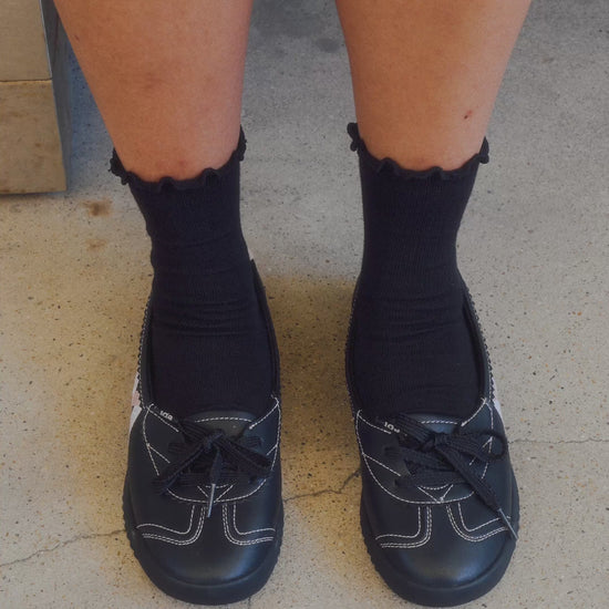 Sneaker style flats with ribbon accents. Adjustable front laces provide fit versatility.